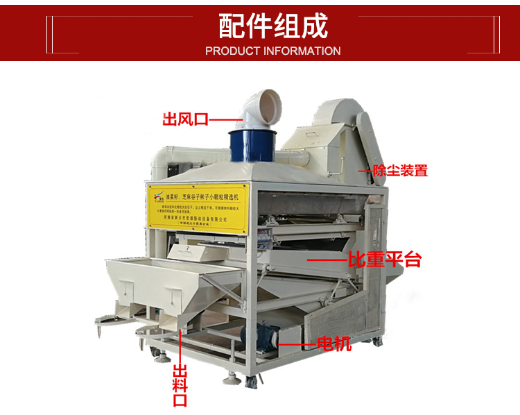 該機按物料大小、重量或外形輪廓的差異進行風選和比重篩選相結(jié)合的谷物清選設(shè)備。該機采用正壓的方式,利用氣流和振動摩擦對物料產(chǎn)生的綜合作用,比重較大的物料沉降到底層,通過篩面的振動摩擦向高處移動,比重較小的物料經(jīng)氣流作用則懸浮在料層的表面向低處流動,以達到按比重分離的目的。該機能有效剔除物料中的雜質(zhì)【霉爛變質(zhì)粒、蟲蛀粒、黑粉病粒、秕谷粒、芽谷粒、大重雜、小重雜、粉塵等】。該機廣泛用于玉米、小麥、水稻、決明子、大豆、蔬菜等農(nóng)作物種子和形態(tài)的草籽,如牧草種、園藝種、林木種等種子的清選加工。
