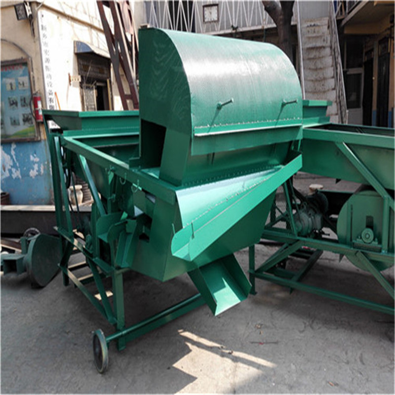 該清選機含有三層篩網,工作時先經過一層篩, 把原糧中比所需篩選物大的的雜質、葉子、泥塊等雜物分離出來,再經過二層篩網經好糧分離開,剩下三層篩網所篩物料即是比好糧小或碎的一些其他雜物。注:再好糧篩出過程中,經過機器本身自帶風機風選出比較輕的灰塵雜物,好糧由前端的出來口排出。